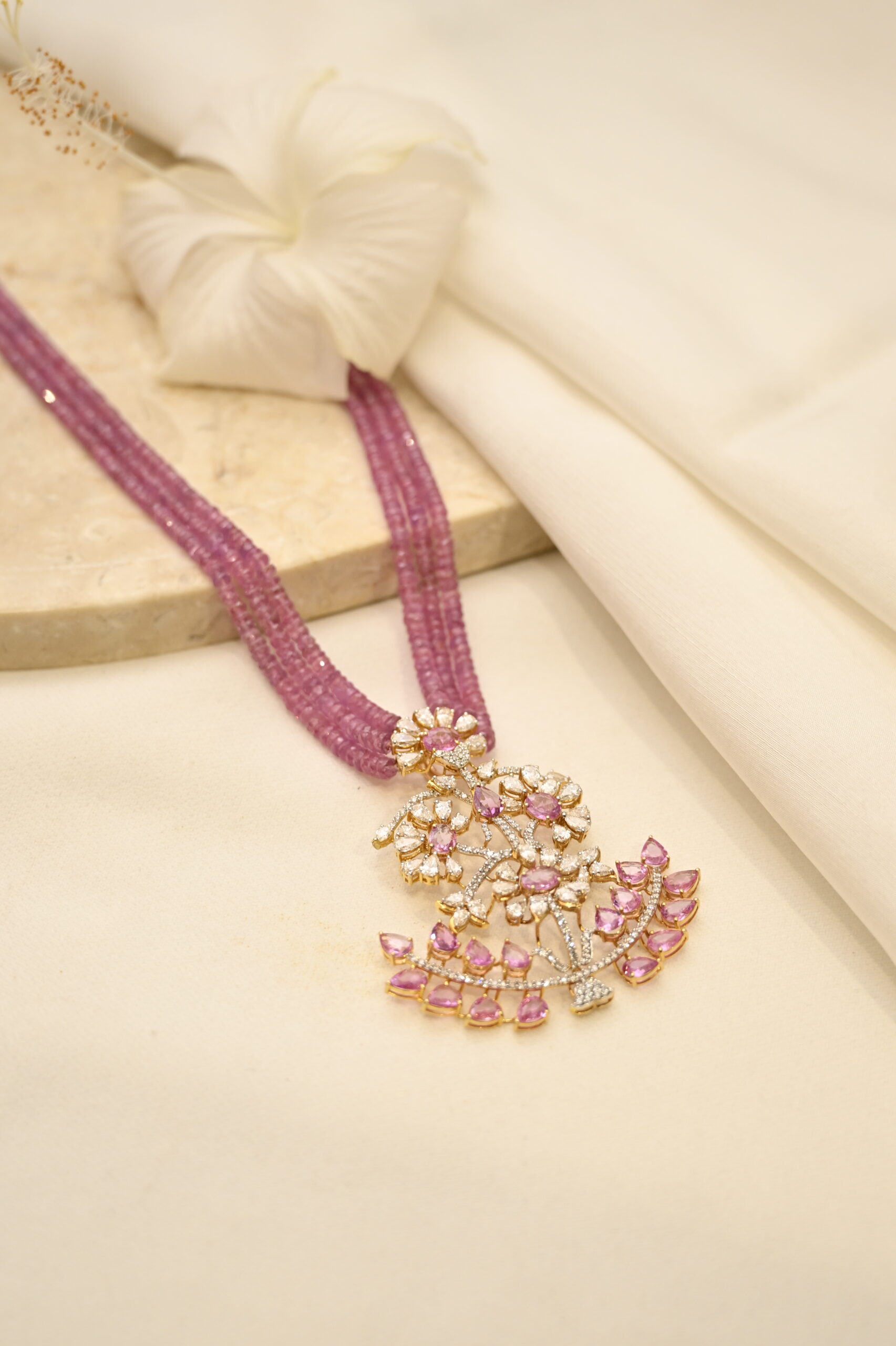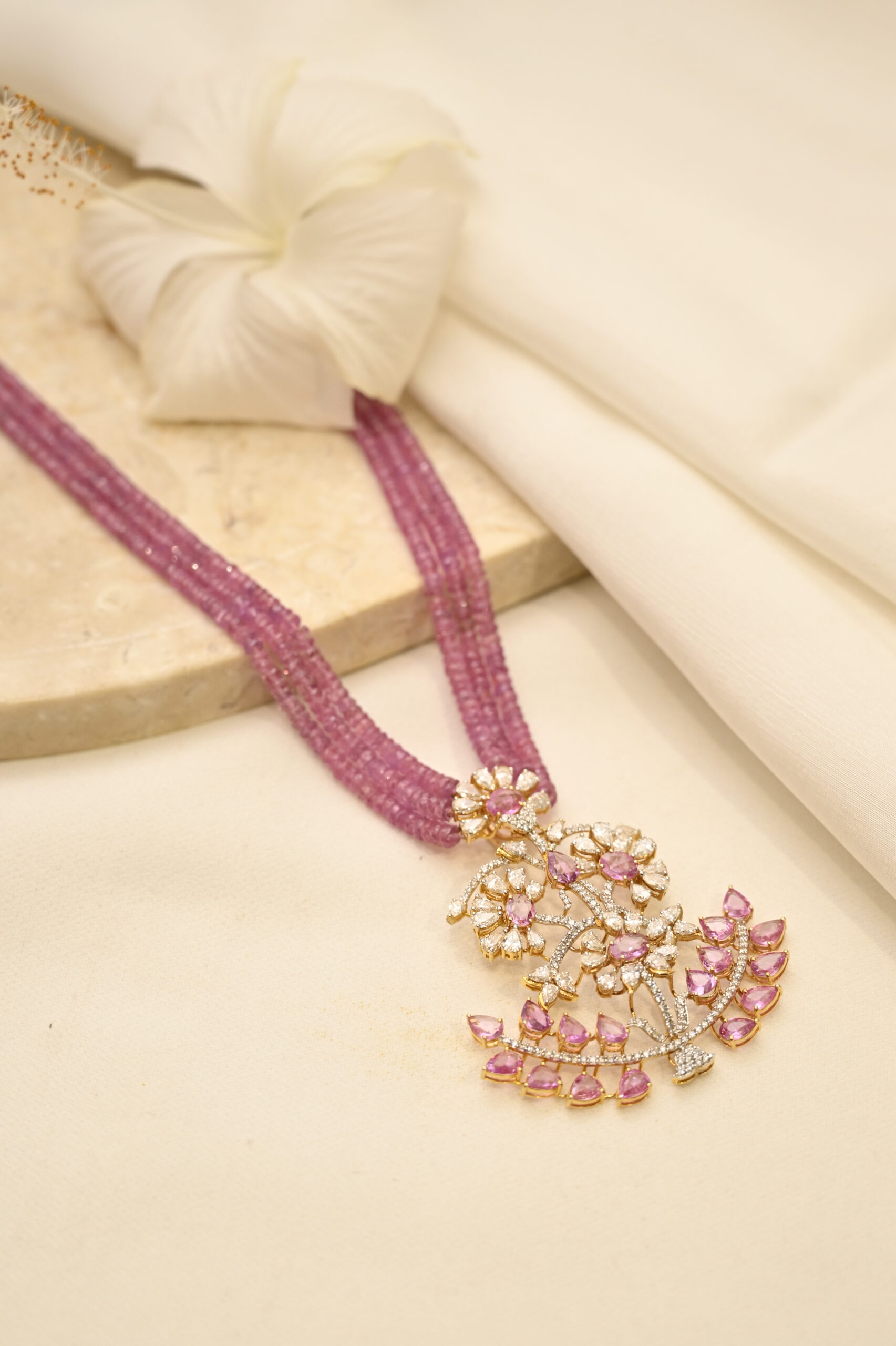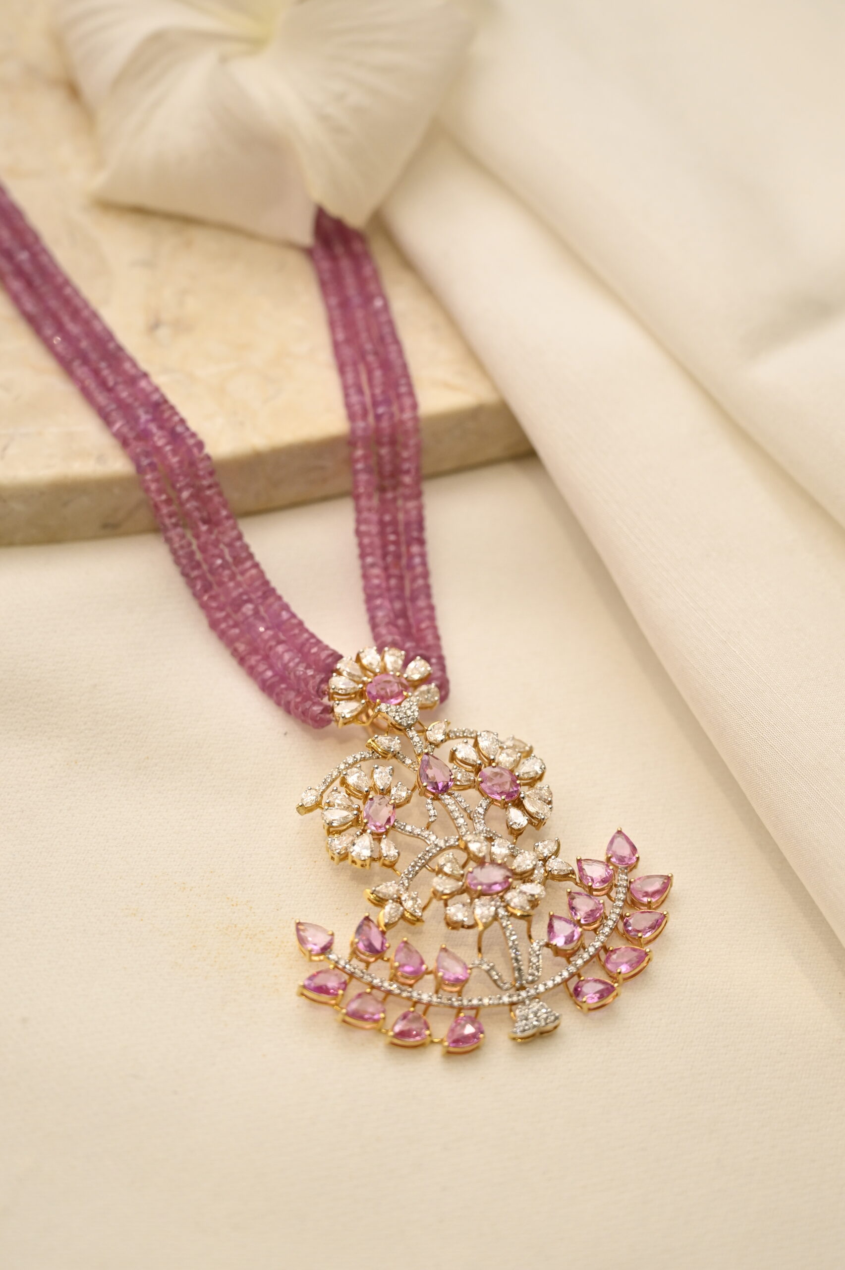 Diamond & Pink Sapphire Pendant with Beads
